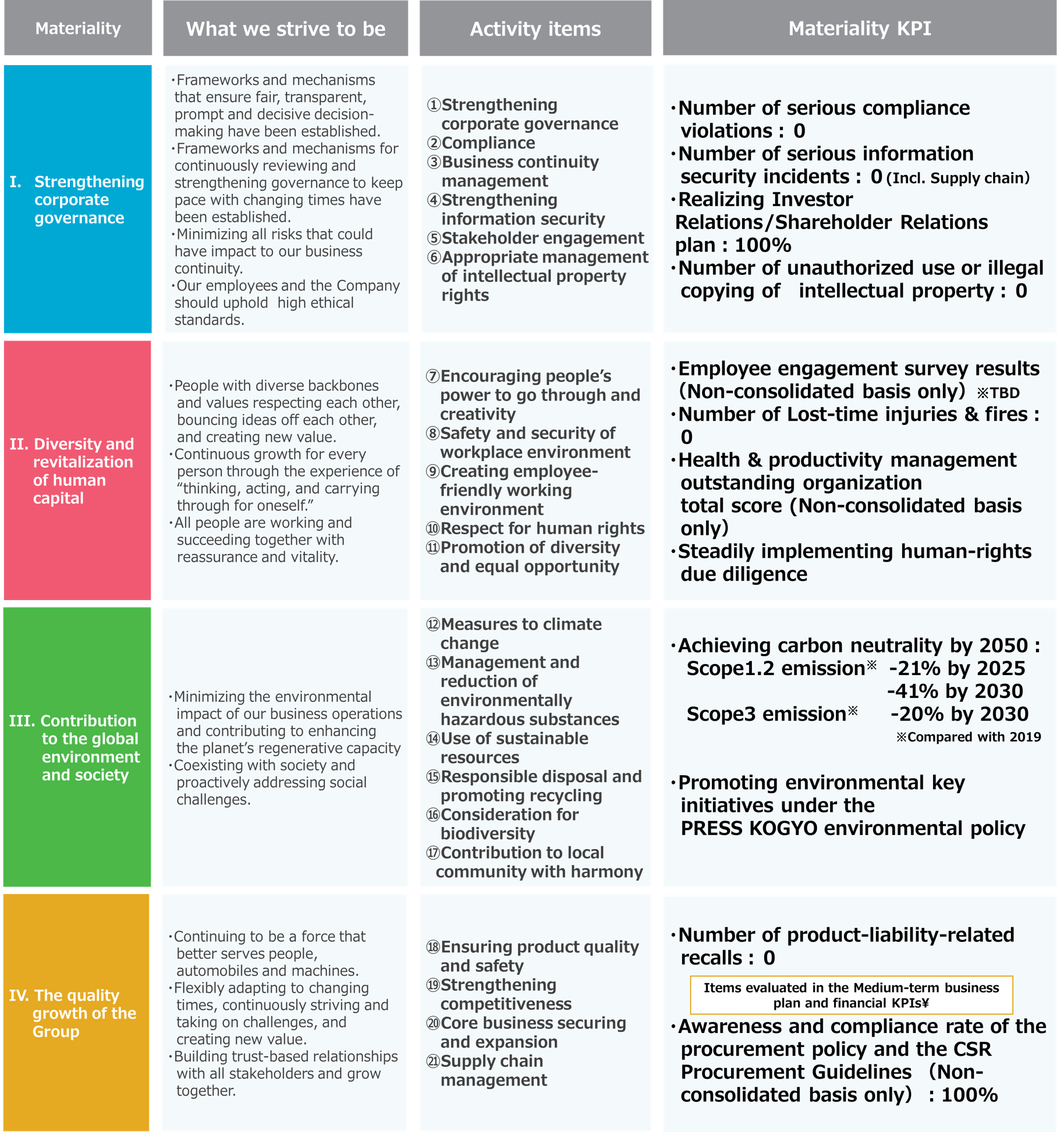 Based on the “Press Kogyo Group Vision, Mission, and Values,” the Press Kogyo Group has identified the following Materiality to be addressed from a long-term perspective, in order to realize sustainable management in which both social value and economic value are achieved.