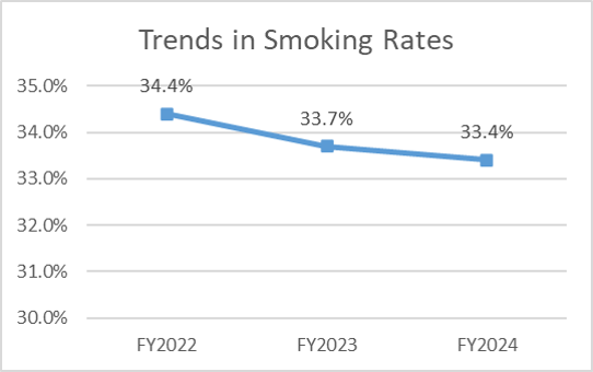 The smoking rate among employees has been gradually declining each year, yet it remains significantly higher than the national average of 15.7% (*). To reduce health risks and strengthen measures against secondhand smoke, we have created a roadmap for implementing a company-wide smoking ban starting April 2028. In April 2025, the President issued a “Company-Wide Smoking Ban Declaration” to kick off the initiative. We are advancing activities based on four pillars: awareness raising, environmental improvements, smoking cessation support, and enhancing smoking literacy.