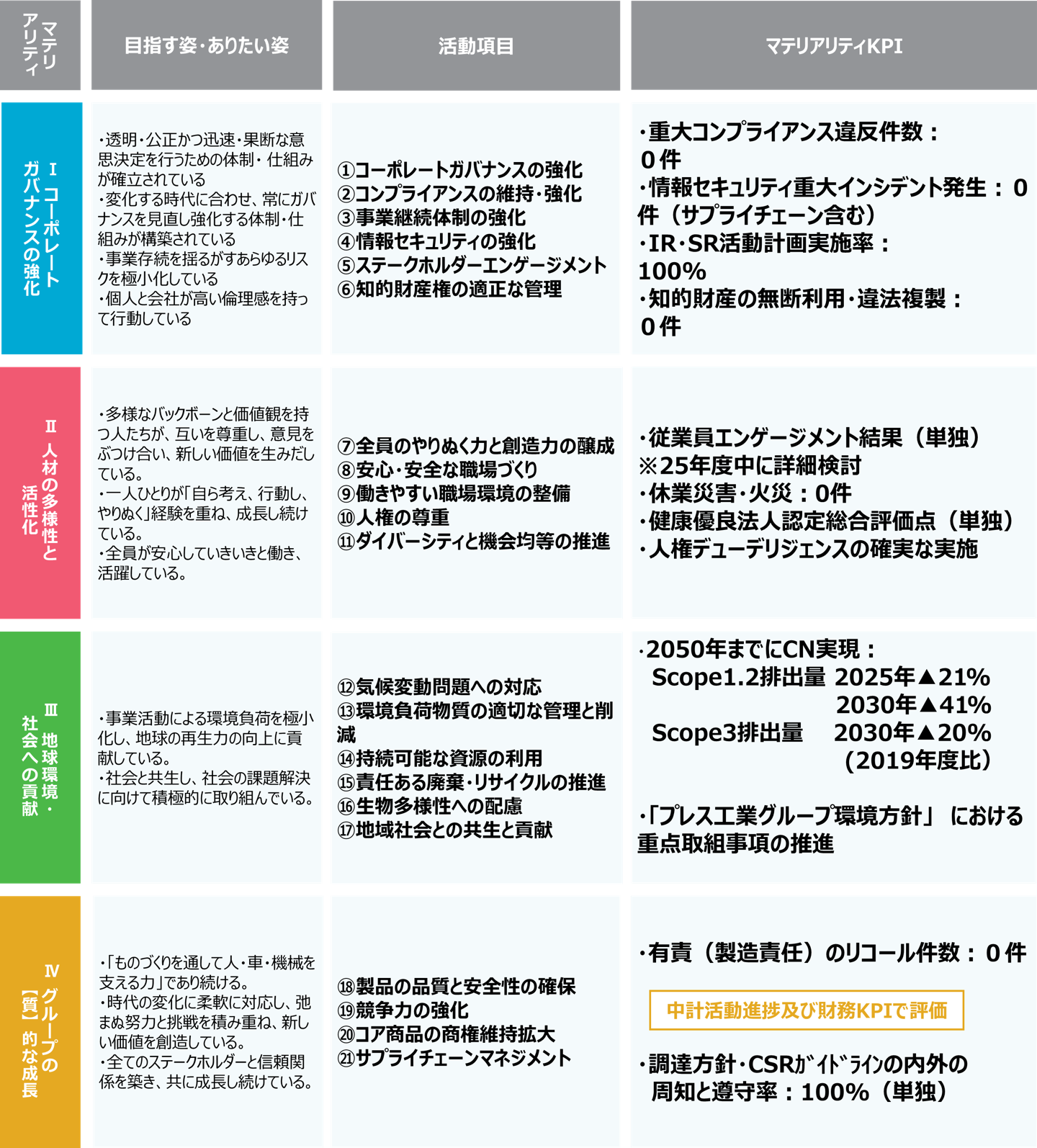 当社グループは、「プレス工業グループ ビジョン・ミッション・バリュー」に基づき、社会的価値と経済的価値の両立によるサステナビリティ経営の実現を目指し、長期視点で取り組むべき重要課題(マテリ アリティ)を以下の通り特定いたしました。また、さらなる取組みの推進のため、2025 年 5 月にマテリアリティの目指す姿・ありたい姿に向けた KPIを設定いたしました。