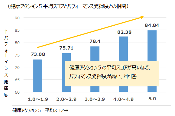 健康アクション5の5項目平均点を1点台~5点台の5階層に分け、階層ごとのパフォーマンス発揮度を分析した結果、健康アクション5の平均点が高い人ほど、パフォーマンス発揮度が高いと回答していることが分かりました。